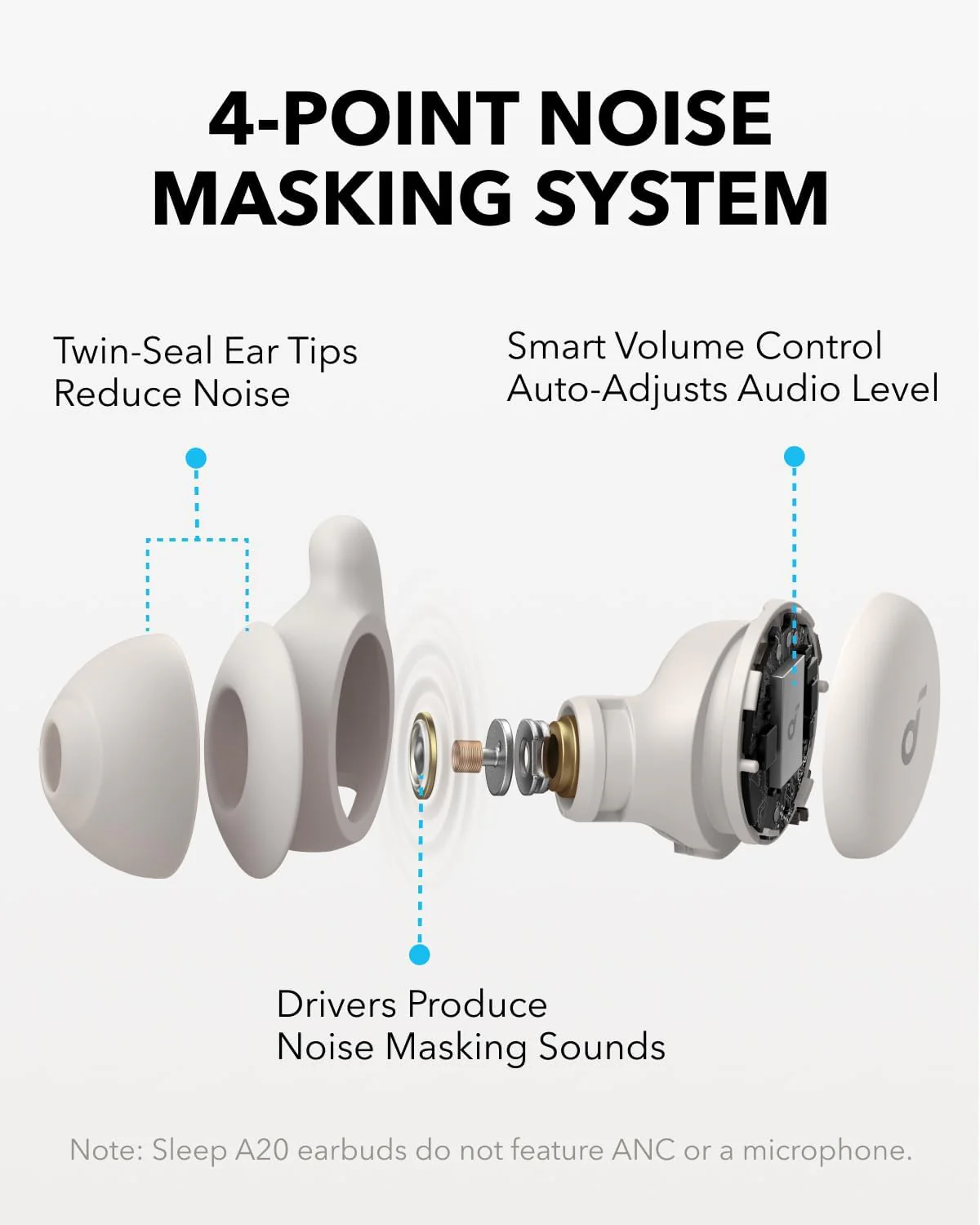 - Full Night of Peaceful Sleep: Equipped with a range of features, experience our exclusive 4-point noise masking system, twin-seal ear tips with 3× stronger passive noise blocking, sound masking, and smart volume control to prevent unwanted noise. Note: Sleep A20 earbuds do not feature Active Noise Cancelling.
